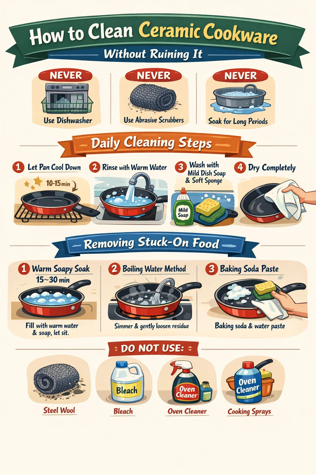 Jednako važno kao i poznavanje pravih metoda je znati što u potpunosti izbjegavati. Nekoliko uobičajenih proizvoda i alata za čišćenje kuhinje značajno će skratiti vijek trajanja vašeg keramičkog posuđa s neprijanjajućim premazom.