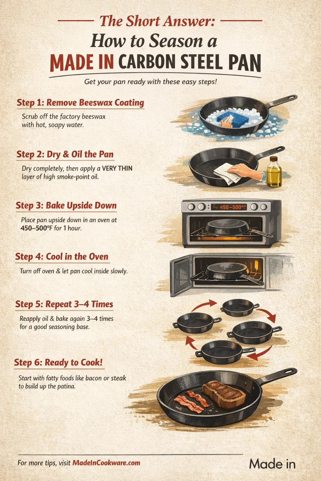 Metoda pećnice preporučuje se za početno začinjavanje posuda od ugljičnog čelika Made In jer zagrijava cijelu površinu - uključujući stranice i vanjštinu - ravnomjerno i dosljedno. Evo detalja o procesu: