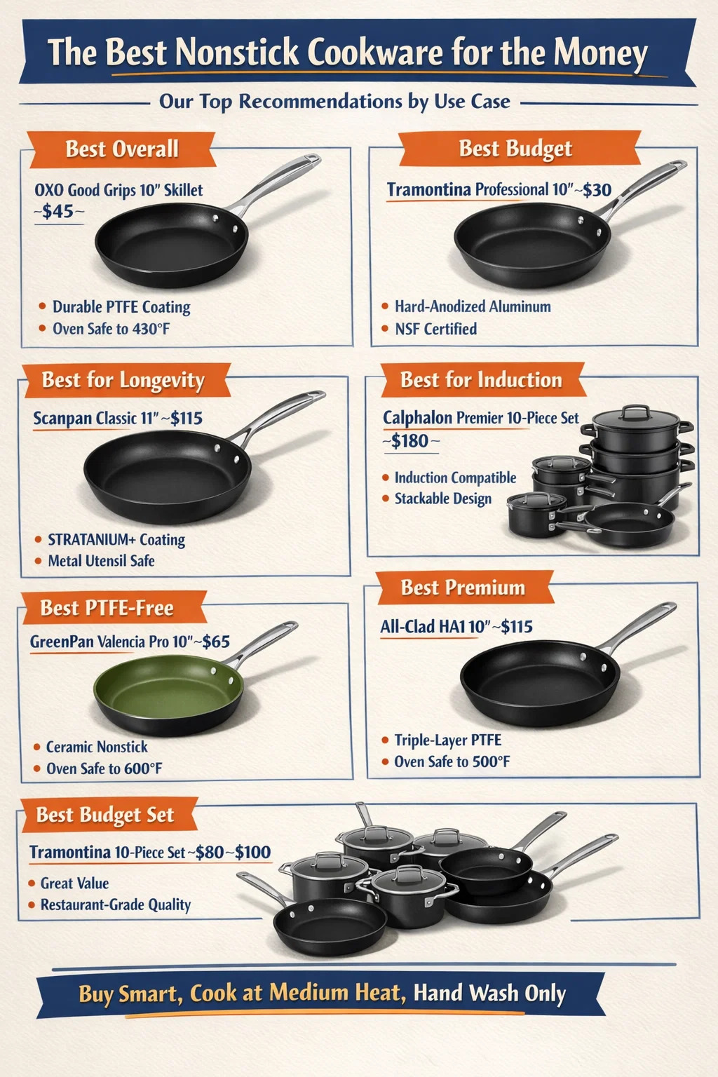 - Najbolje za indukcijske ploče za kuhanje : Calphalon Premier set od 10 dijelova (~180 USD) — dizajn za slaganje, kompatibilan s indukcijom kroz komplet, troslojni PTFE, siguran za pećnicu do 450°F.